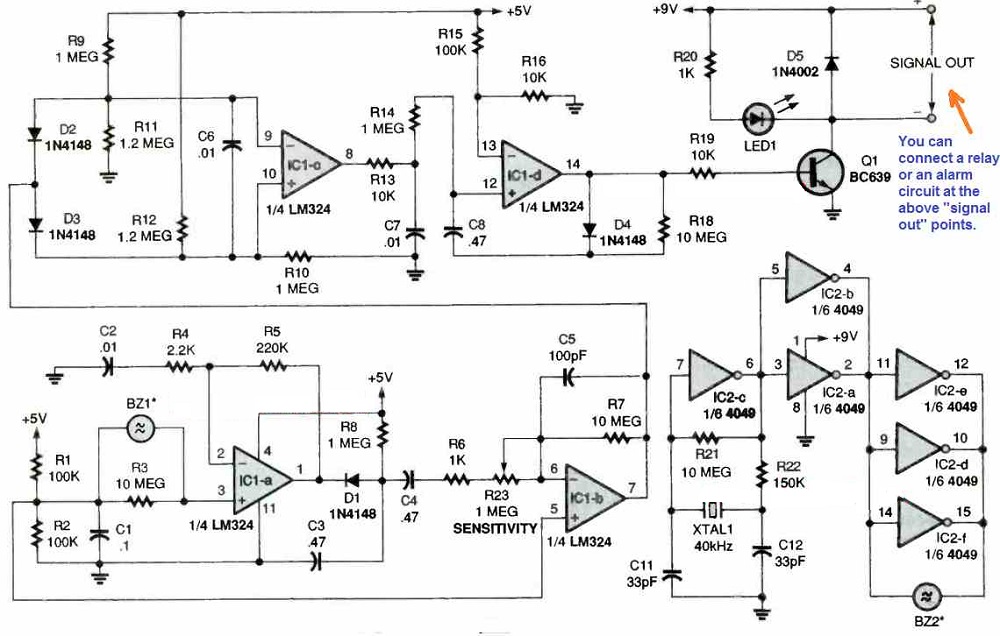 超聲波運動探測器的電路圖可以在下圖中看到。