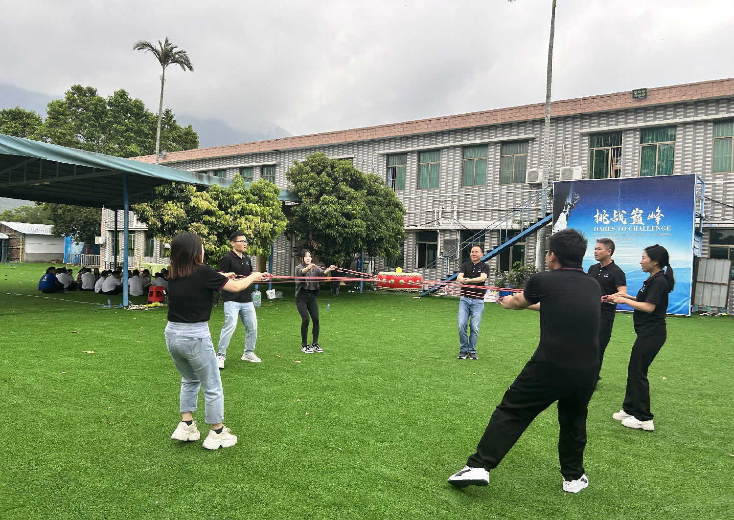 第三個(gè)游戲擊鼓顛球,考驗(yàn)的是團(tuán)隊(duì)中需要的配合、技巧和力度。我們從左到右,再?gòu)挠业阶螅粩嗟匾苿?dòng)位置,實(shí)現(xiàn)精確控制球體在圓鼓中彈跳,異曲同聲的喊著響亮的口號(hào),總分展現(xiàn)出團(tuán)隊(duì)帶來(lái)的精神力量。